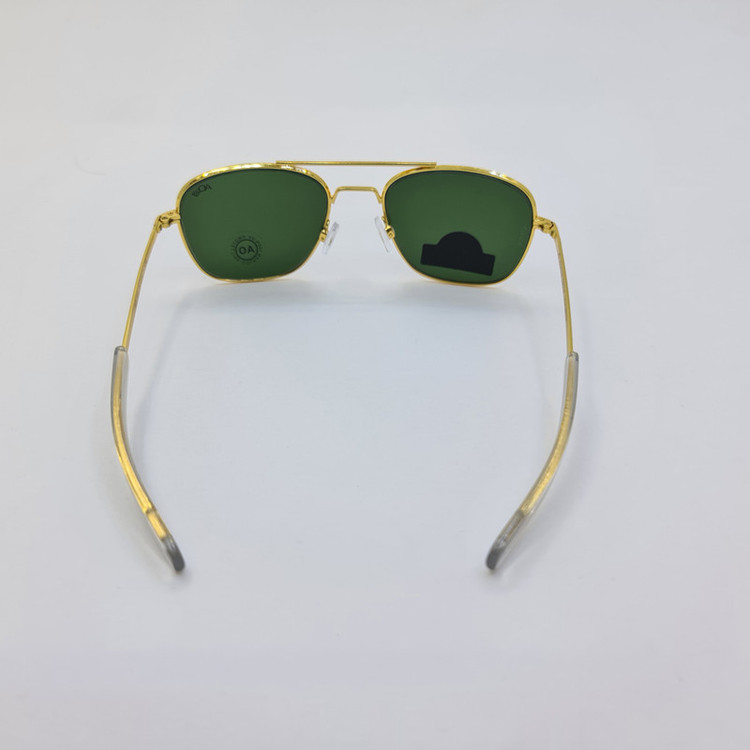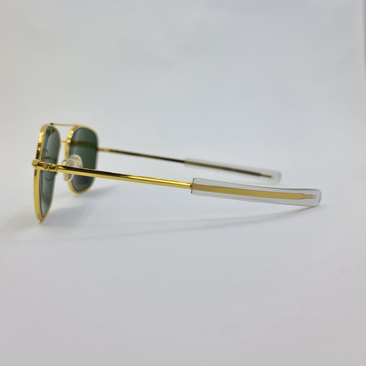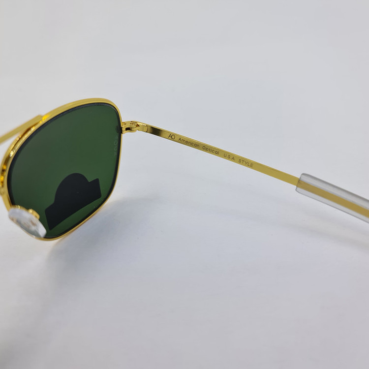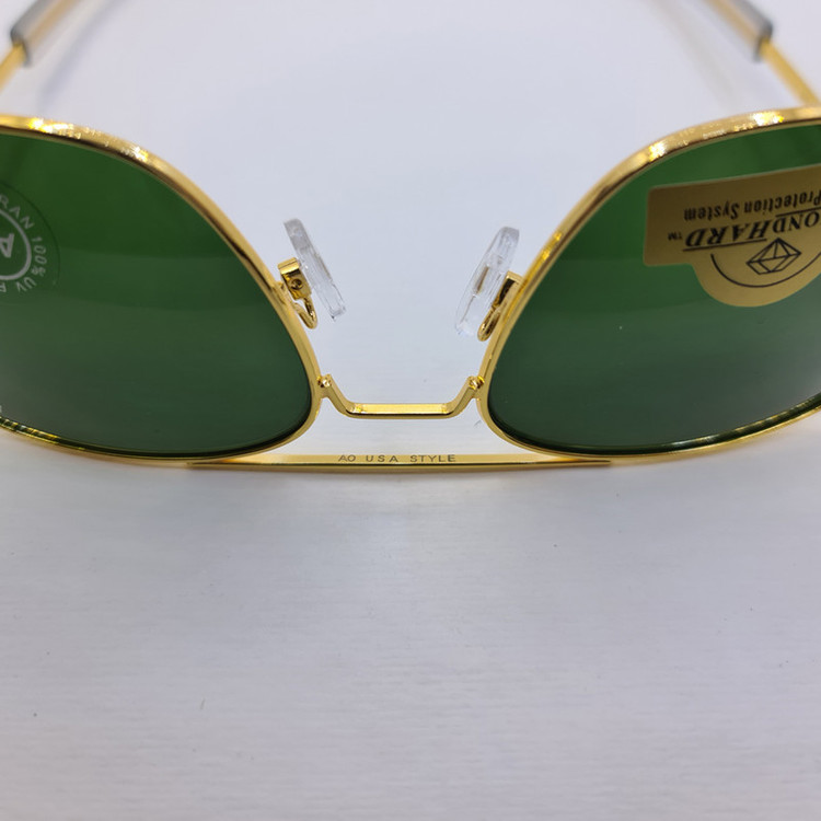 عینک آفتابی امریکن اپتیکال AO با عدسی سبز و فریم خلبانی مدل C2 یک عینک افتابی خاص میباشد که توسط برند امریکن اپتیک (American Optical) تولید و طراحی شده است. فریم و دسته این عینک آفتابی آ او از جنس فلزی بوده و ضد حساسیت است و در زمان استفاده به پوست صورت شما آسیبی وارد نمیکند. دسته و فریم این عینک آفتابی برند اپتیک با عدسی سبز، به رنگ طلایی بوده و رنگ ثابتی دارد و در اثر استفاده زیاد، تغییر رنگی در ان مشاهده نخواهد شد. در انتهای دسته این عینک دودی اپتیک، یک بخش پلاستیکی بی رنگ وجود دارد تا در زمان استفاده به گوشهای شما آسیبی وارد نشود. لولایی که بین دسته و قاب این عینک اپتیک با عدسی سبز کار شده است از جنس فلزی بوده و مقاومت مناسبی در برابر ضربه و فشار ناگهانی دارد. برای طراحی این عینک آفتابی اپتیک با عدسی شیشهای و سبز رنگ، دو پل بینی در نظر گرفته شده که هر دو از جنس فلزی بوده و رنگ نقرهای دارد